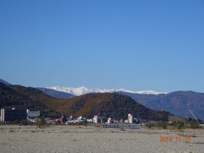 遠く見える北アルプスは真っ白ですが、